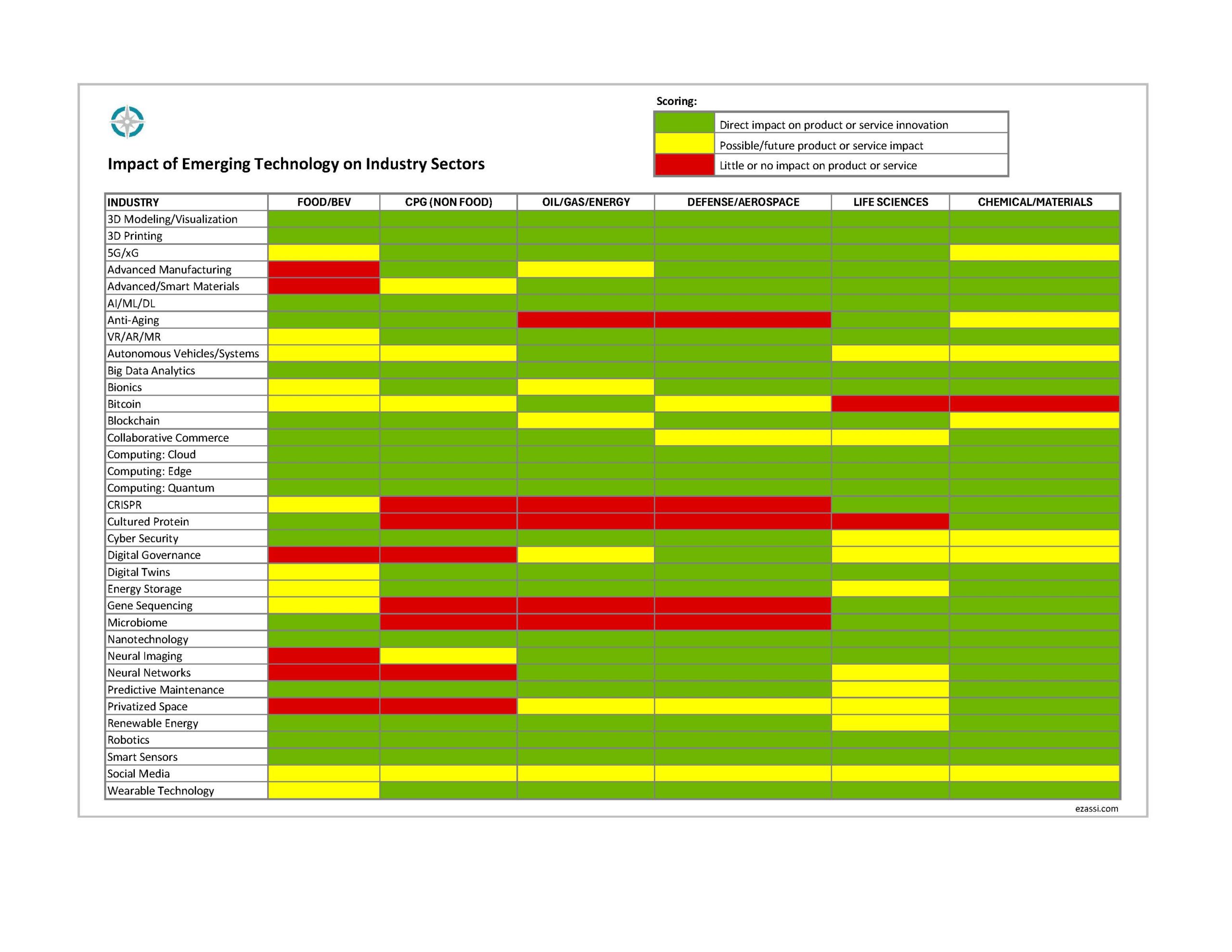 With this detailed analysis, we’ll also rank the importance of each technology across different industry verticals, helping you focus your research and innovation strategies to best position your business for the future. Ezassi identifies specific implications for the CPG, Aerospace and Defense, Energy, Life Sciences, Chemicals and Material Manufacturing industries.